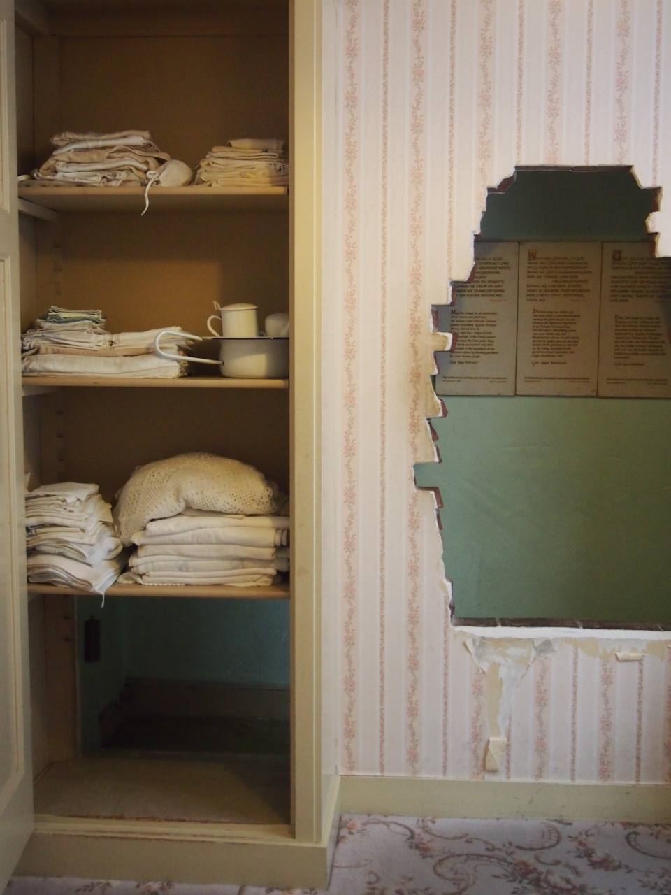 テンブーム家はいまでも時計屋を営んでおり、その自宅にはユダヤ人を匿った部屋や、万一ナチスが踏み込んだときにリネン室の壁の間に潜むことが出来るように用意していた空間を、当時のままに保存してあります。