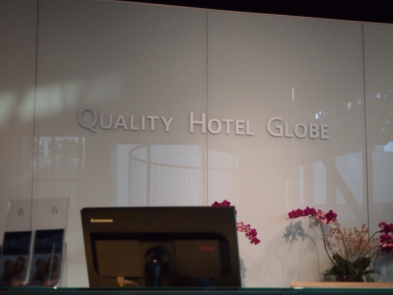 駅をでたら歩道橋をそのまま渡り、ショップの入り口を通り越して最初の角を右に曲がって少し歩くと左手にホテルの入り口の回転ドアがあります。エスカレーターで一階下がるとフロントがあります。