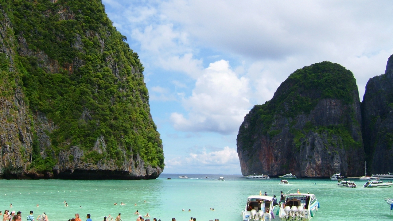 ビーチの舞台はピピドン島ではなく、ピピレイ島のマヤ湾という場所です。揺れるジェットボート(しかし早い)に乗ること40分。見えてきました、岩壁の間に広がるビーチ、予想以上のボートの数と海面にうかぶ人々の頭を見てちがった意味で驚き、いやーきれいですよ、あのビーチの海です。