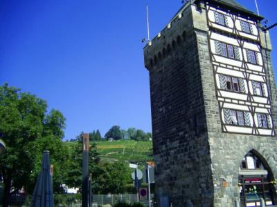 丘の上はワイン用のブドウ畑も見える。城門のタワーとブドウ畑のコントラス...