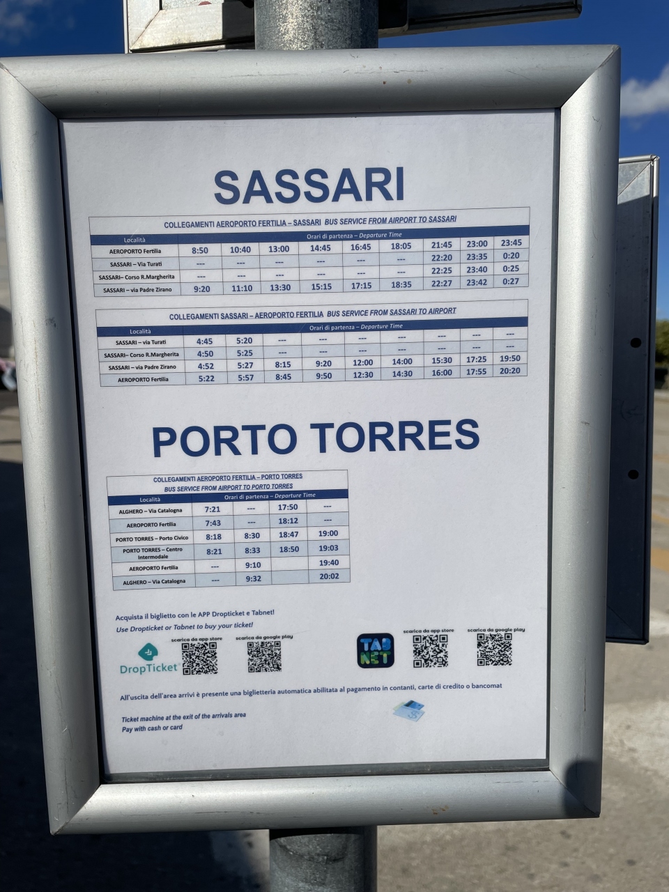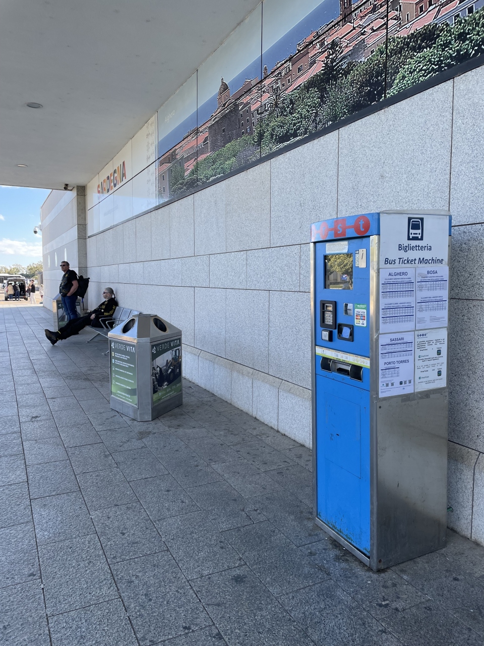 アルゲーロやサッサリへ向かうバスは、到着ゲートからロビーに入って右手の出口を出てすぐのバス停から出ますが、チケットの券売機はバス停前にはなく、インフォメーションカウンターのある正面出口から出て右手にひっそりとあり(バス停から正面玄関に周ってもみつけられる)バスの車内で買うと割高らしいので要注意です。券売機はクレカ対応なので、ユーロの現金がなくても大丈夫です。