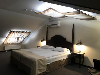 私が泊まったのは奥の棟で、部屋はロフトというのか中に階段があり、入ってすぐがバスルームと小さめのリビングエリア(ソファ、クローゼット、テレビあり)、階段を上がると屋根裏部屋風のベッドルーム(ベッド、チェスト、ドレッサー、一人がげソファ、テレビあり)になっていた。