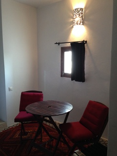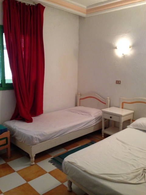 室内はシンプルなりにチュニジアらしさも感じる内装。ベランダにタイル張りベンチあり。テレビ・エアコンあり。冷蔵庫なし。シャンプー・リンス・ドライヤーなし。