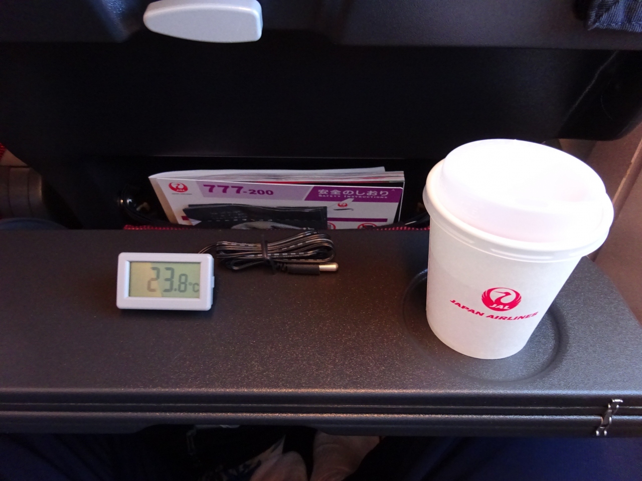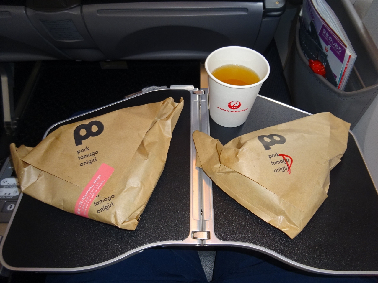 F席は取れなかったので,JAL提供の烏龍茶と持ち込みの「ポーたま」むすびでの健康的な機内食を戴きました。- 旅行時期