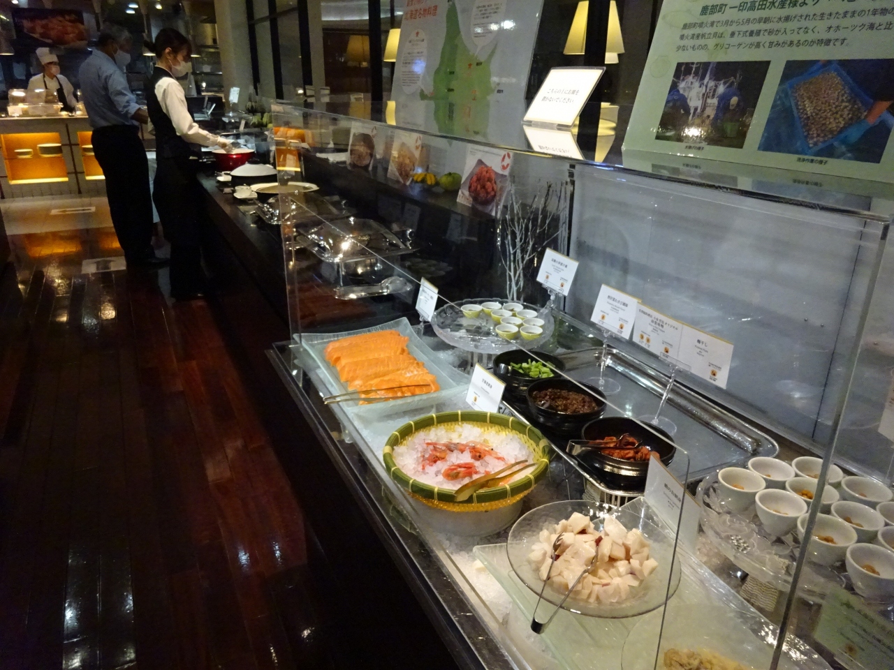 2泊したので2回利用しましたが,初日は初めの方に列んでいた海鮮等を少しずつとったつもりだったものの,たちまち大きな皿一杯になってしまいました。