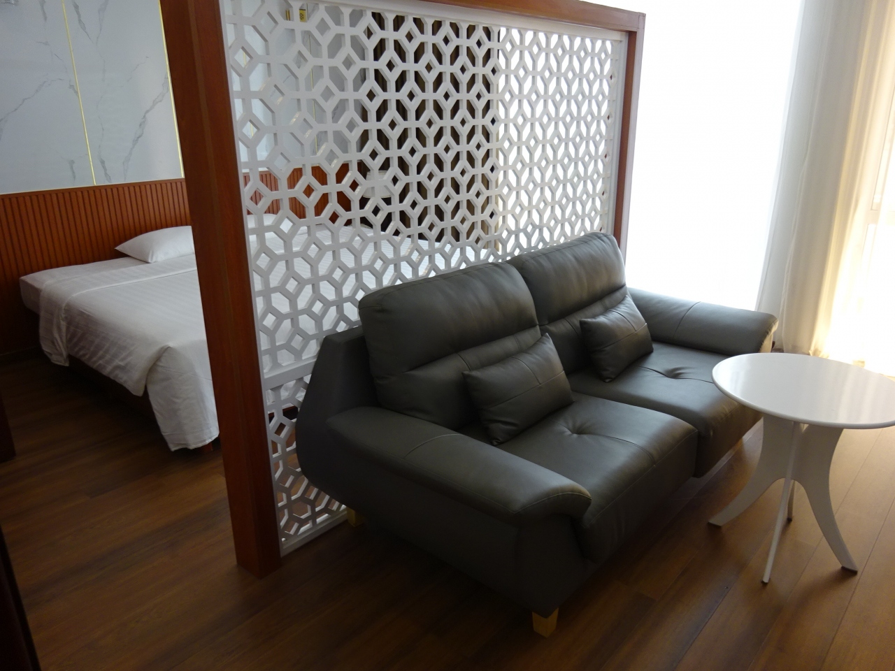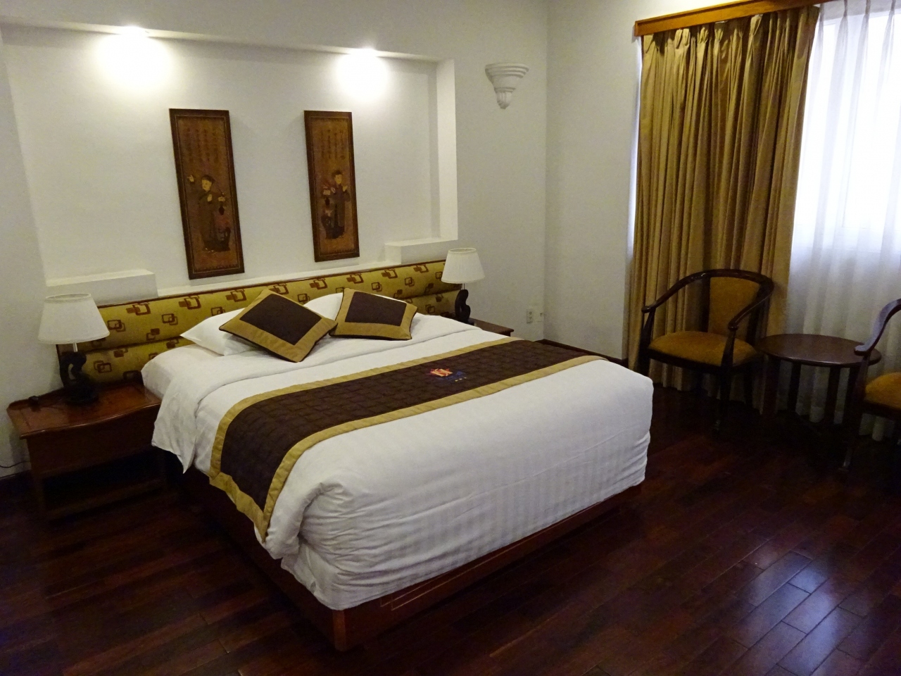 値段が安かったので,スーパーデラックスという上位の部屋を予約したのですが,2回目の宿泊と言うこともあってか,さらに上のホンセン・デラックスという部屋にしてくれました。… 部屋はそれほど広くはないものの,ベッドとリビングの間に飾り模様の間仕切りがあって,少しだけリッチな気分が味わえます。バスタブも脚はついていなんですが,猫脚付(?)タイプの楕円形をしてました。バルコニーも付いてました。- 旅行時期