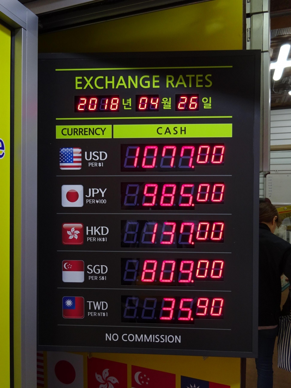 2018年3月26日のレートでは,1万円が₩99,850でした。…翌日,「テバクナラ両替所」の前を通った際には,いつも階段の手前に表示されているレートが空欄になっていました。- 旅行時期
