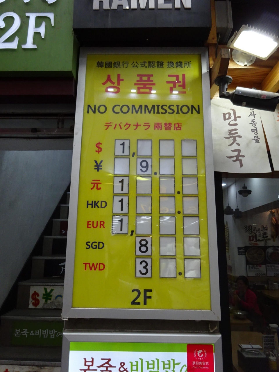 ここのところ,明洞での両替は「大使館前両替所」と「テバクナラ両替所」を比較してレートの良い方にしていましたが,その差は僅かなので短い日程であるならば街歩きの動線にある方で両替をしても良いと思います。