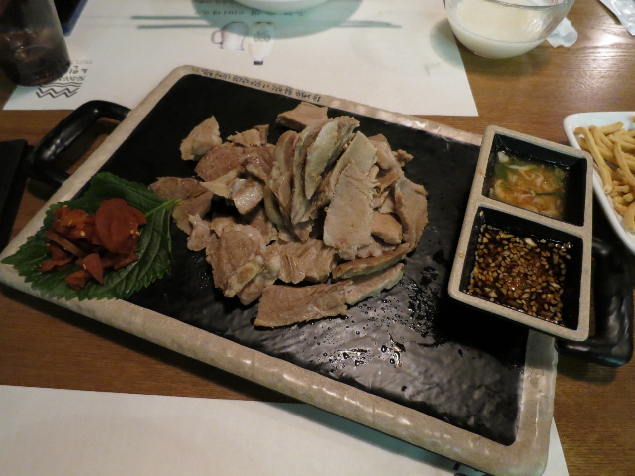 主役のマッコリは,醸造の日数によって春・夏・秋・冬と名付けられていて,テイスティングセットが供されます。…我々は,夏を選びました。