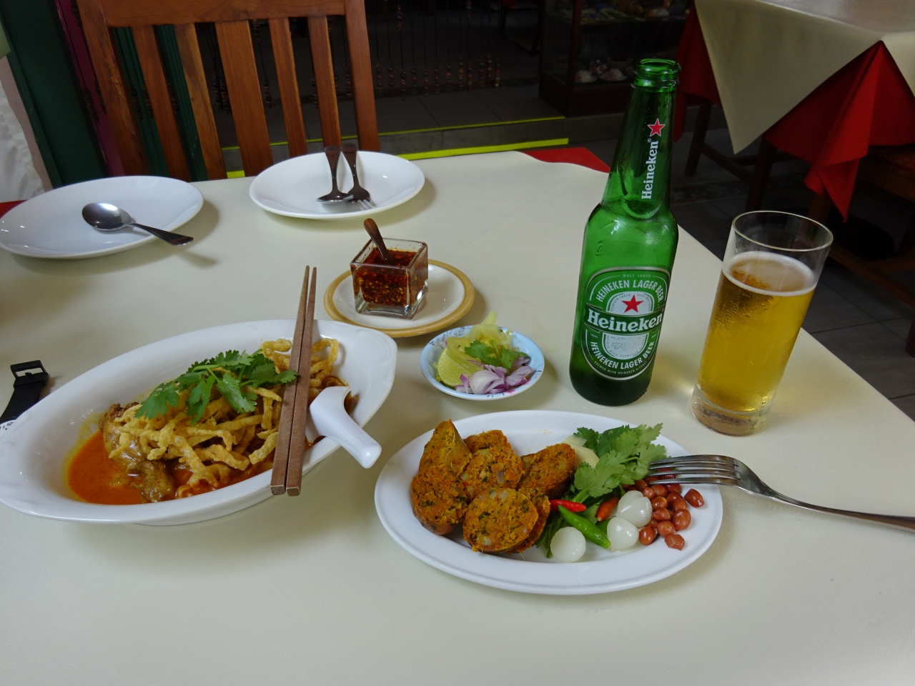 サイウア(イサーン風ソーセージ)をつまみに,ビールで一息。カオソーイも食べてみましたが,残念ながらちょっと辛めでココナッツの風味が感じられませんでした。