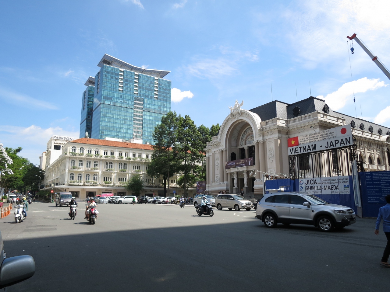 ドンコイ通りに並ぶグエンフエ通りが公園のような広場になり,そのどん詰まりに人民委員会庁舎が建っています。