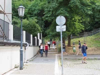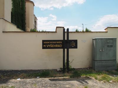 この17番で、バラツキー橋を過ぎると鉄道の高架橋がかかっている場所があります。この高架橋の直ぐ手前がトラム停でここで降りる。そしてこの高架橋をくぐるように川沿いの道を進むと左側に入り口の案内板があります。そこを丘の上に目指して上ると直ぐです。
