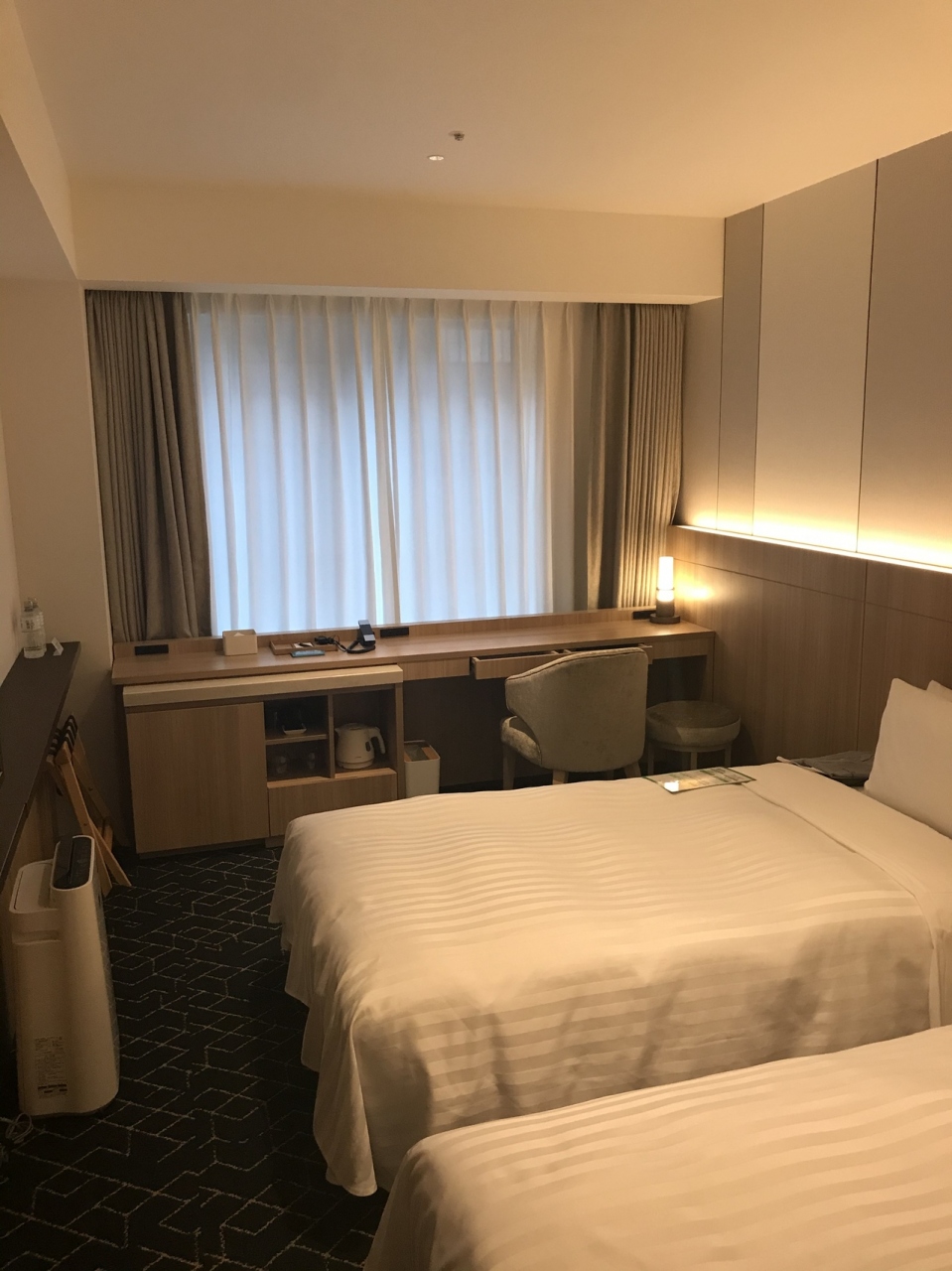 札幌旅行で札幌駅に近いホテルで利用しました。出来てまだ新しいホテルらしいので、とてもきれいな外観と客室でした。部屋はちょっとおしゃれな色使いでゆったりと落ち着けます。広さは狭くも大きすぎでもない大きさでした。