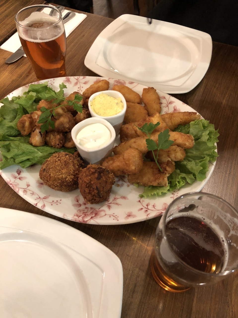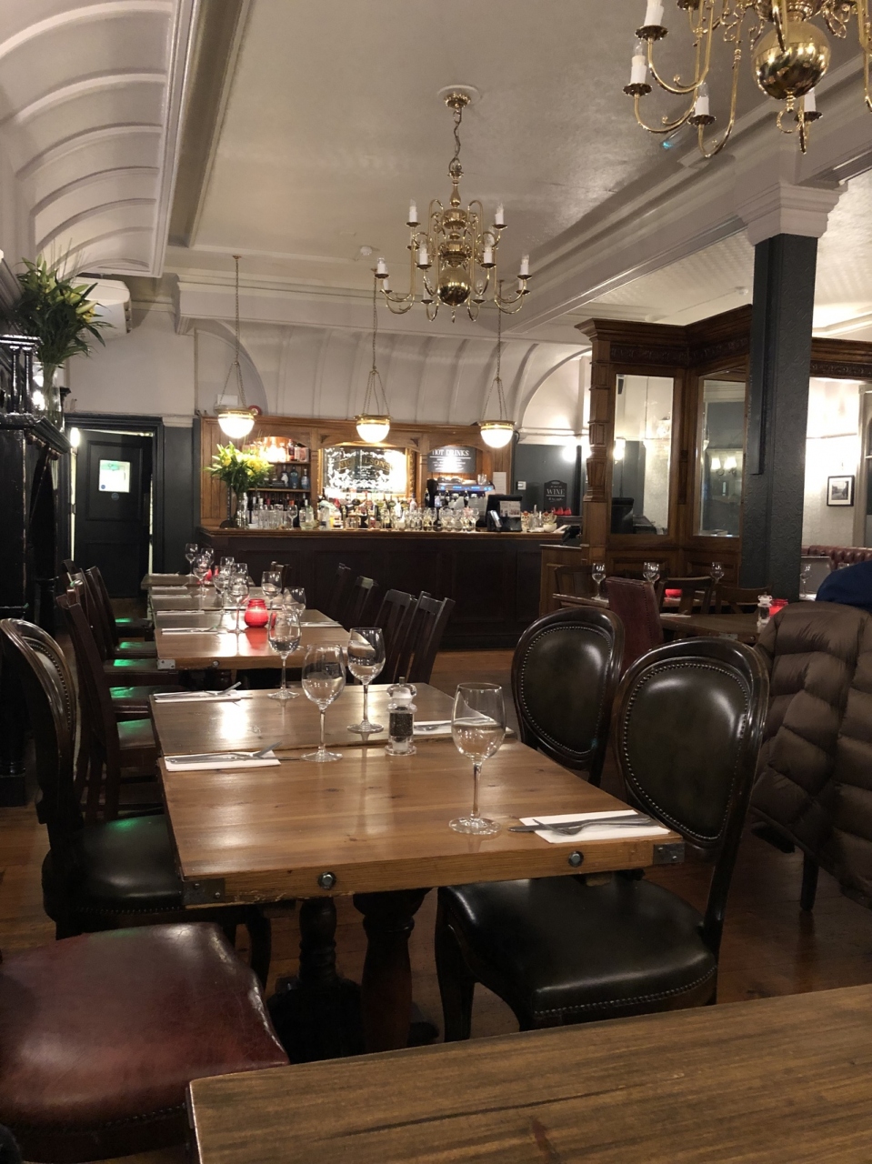 1階はサッカーの試合を大型画面で観ながらビールを飲む🍺お客さん。騒がしいことはなく落ち着いて和やかな雰囲気でしたが、私達は2階へ上がり、食事とビールとおしゃべりに過ごしました。女性同志でお喋りしながらの英国人が何組か居て、ゆっくり食事出来ます。