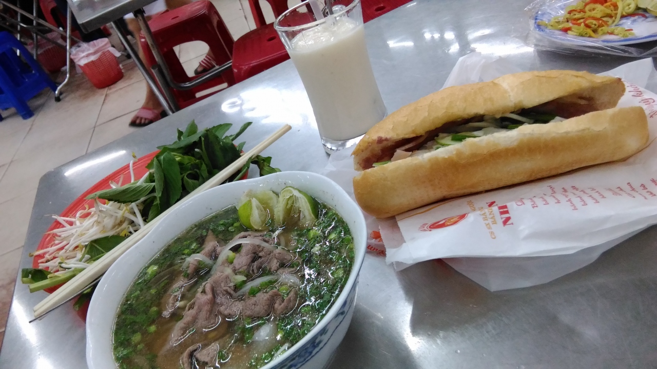 まず店の前でバインミー25,000ドンを買って、店に持ち込んでからフォーとスムージーを注文しました。若干高めかなぁと思いますが、味は最高でした。