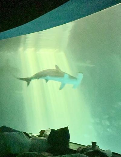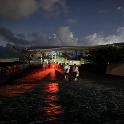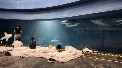 屏東県にある国立海洋生物博物館で宿泊体験してきました。16時にロビーに集合、60名くらいいたでしょうか、各チームごとにスタッフがついて案内開始、オリエンテーションでは布団の敷き方やルールの説明。世界水域エリアで2班、自分は総勢18名のE班。世界水域エリアを解説を聞きながらほぼ9割方いっしょに回ってくれて、日本語ができるZさんが自分一人のために日本語解説をしてくれました。サメ水槽前は10名、知らない方々と布団を並べて就寝。男女子供関係なく朝を迎えます。7時の起床前に目の前の薄暗い水槽を優然と泳ぐ巨大なシュモクザメは圧巻でした。だんだんと陽が昇り差し込む太陽光に輝く魚影が美しかったです。翌日は残念ながら担当が変わり日本語での案内はなく少々戸惑いましたが想定内。都度スマホ翻訳をみせてくれながら対応いただき感謝です。食事は夜朝ともビュッフェで台湾南部の家庭料理なスタイル、バックヤード見学や夜食体験はかけがえのない経験。各種イベントは少々子供向けかな?とも思いましたが、水族館に、巨大な水槽の前で眠る体験は最高でした。