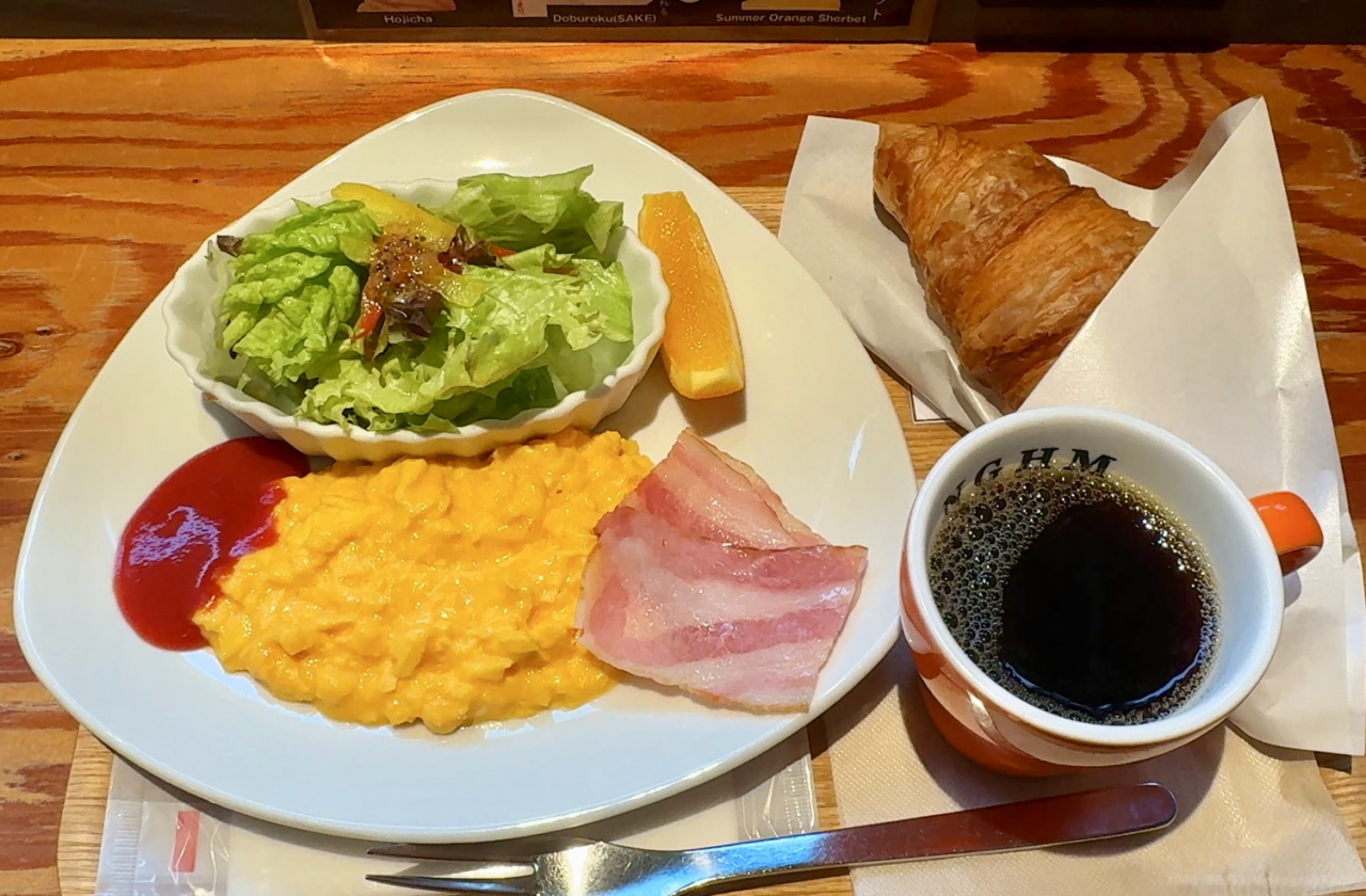 JR盛岡駅の西口、繁華街の逆の模様でオフィスや駐車場が多くあり、とても静かに過ごせました。朝食付きにしたところ、併設の「ナガハマコーヒー」さんでブレックファースト、香り豊かな珈琲とともにいただく朝食は格別でした。