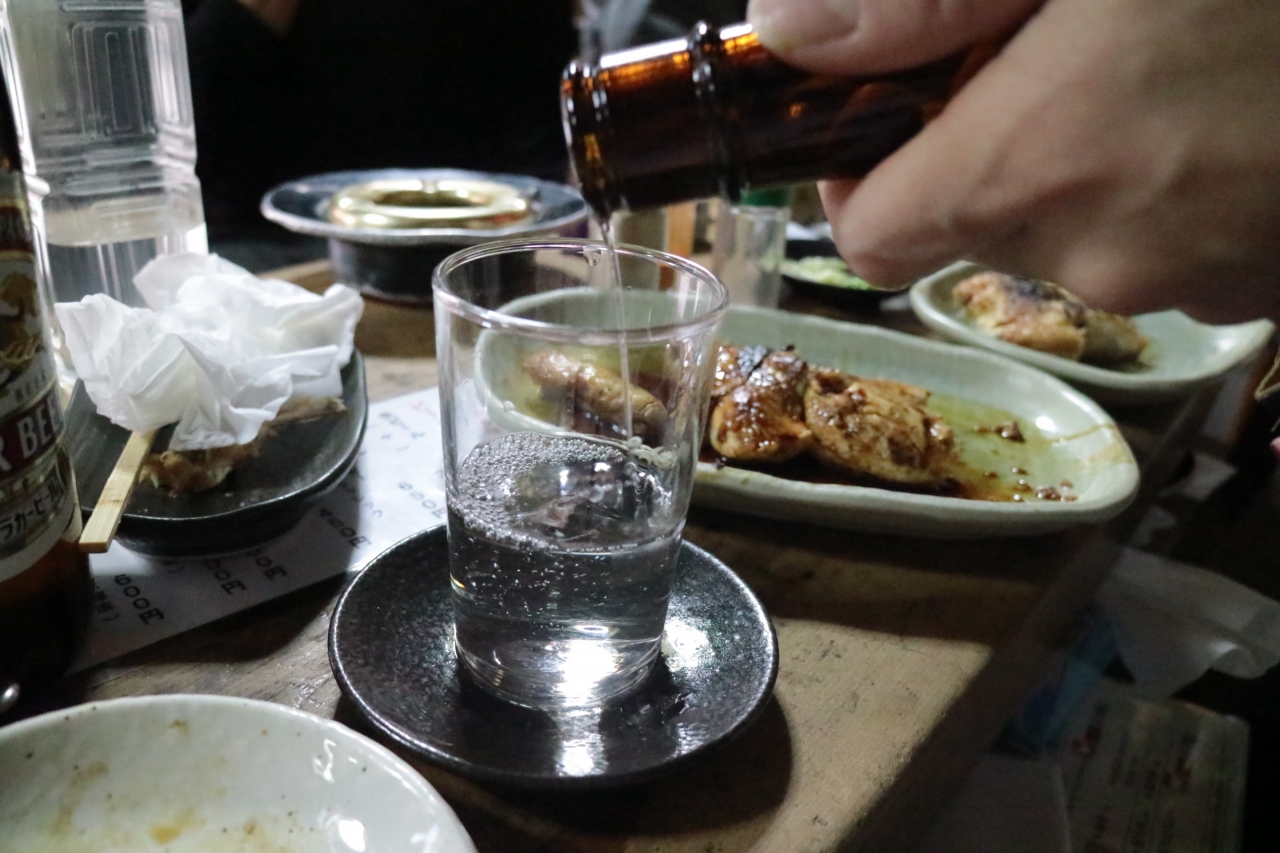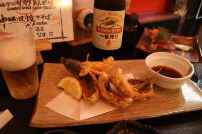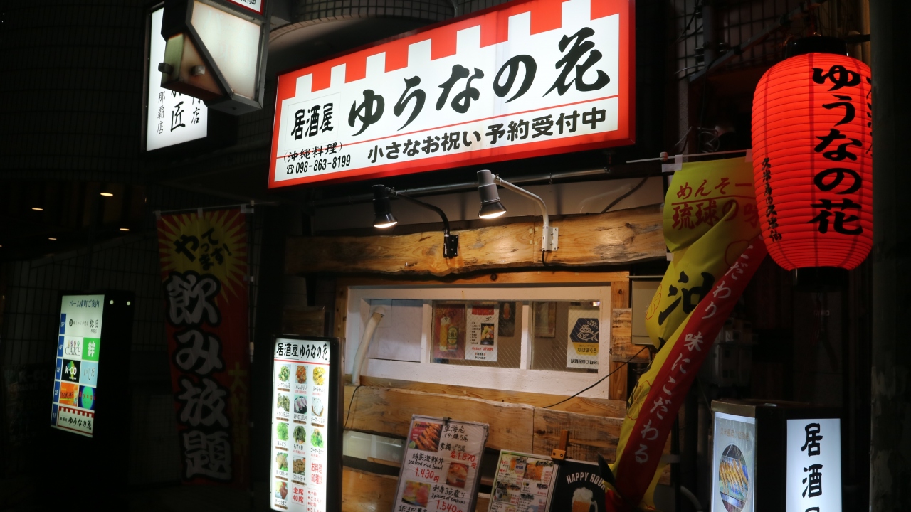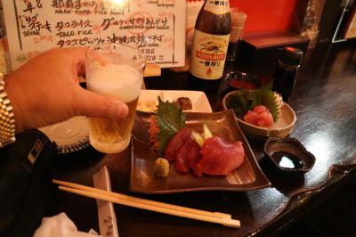 那覇の泊港で獲れるマグロのテレビ番組を見てホテルでこのお店「居酒屋ゆうなの花」を紹介して頂きました。ビルの地下にあるお店で、年の瀬ということで近くのオフィスは年末年始休みに入っているため客は自分一人。先ずは、ビールでマグロのお刺身を頂いた。