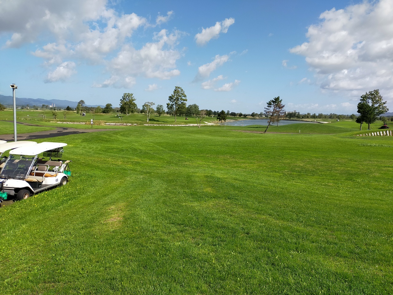 前日深夜までの台風の影響が心配されたが、朝には雨と強風がおさまり、台風一過の晴天で絶好のゴルフ日和。