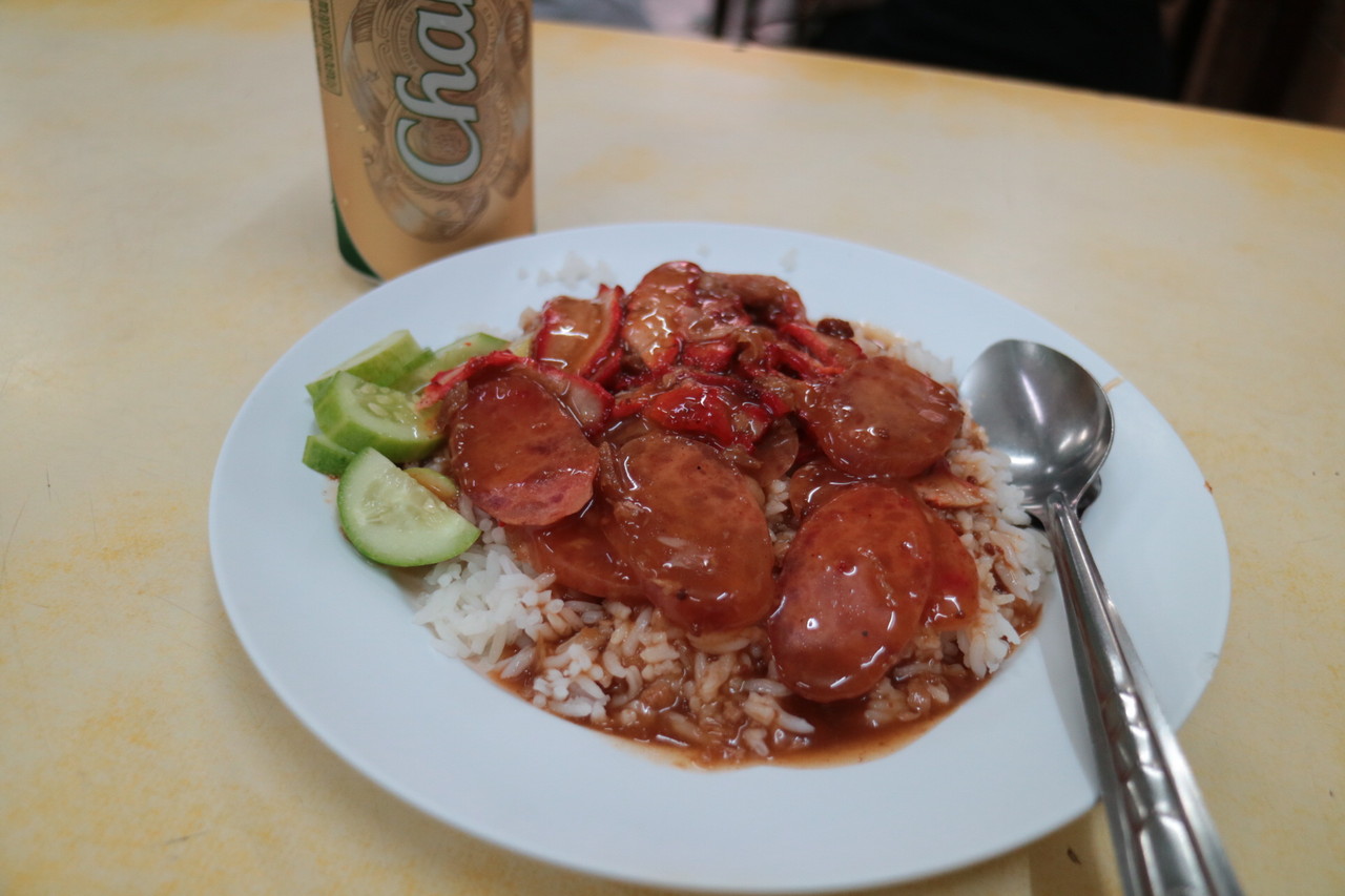 ここのお店の名物は、カオムーデーンという焼豚に甘いタレをかけた料理だ。