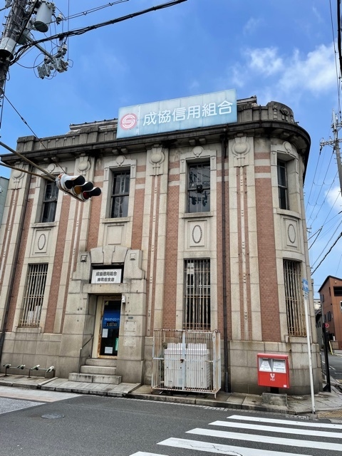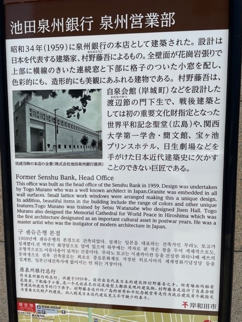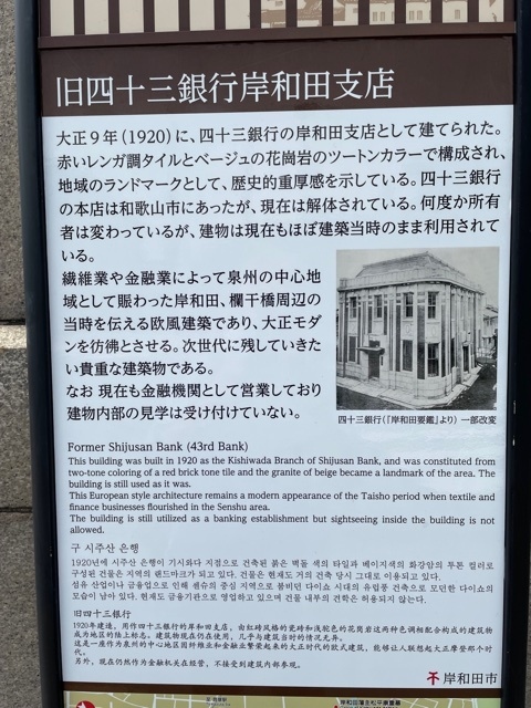 大正8年に四十三銀行岸和田支店として建てられました。赤レンガと花崗岩で構成された2階建てです。重厚感ある姿です。成協信用組合岸和田支店となっている現在も建築当時のまま活用されており、内部は柱が一本も無く、吊り構造によって天井が支えられています