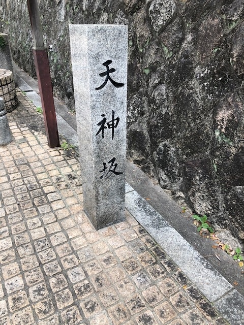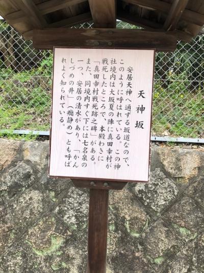 天王寺七坂の一つで、清水寺から安居天神に通じる坂で「天神坂」と呼ばれています。坂を上がる前あたりに、石組みの樋がつくられ、付近一帯に昔から名水があることが偲ばれる。安居神社の境内にも「癇静めの井」(かんしづめの井)と呼ばれる井戸の跡が残っている。