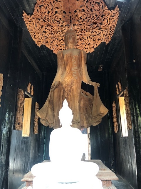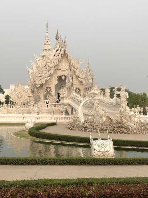 チェンライ出身で仏教や神話を題材にした芸術家チャルーンチャイさんが1997年から建設が始まった白色をコンセプトにしたお寺です。チェンライの町からはトゥクトゥクで20-30分です。お堂の周りにはちょっとグロテスクな彫刻が。お堂の内部の壁画はチャイさんが自ら描いていると聞きました。