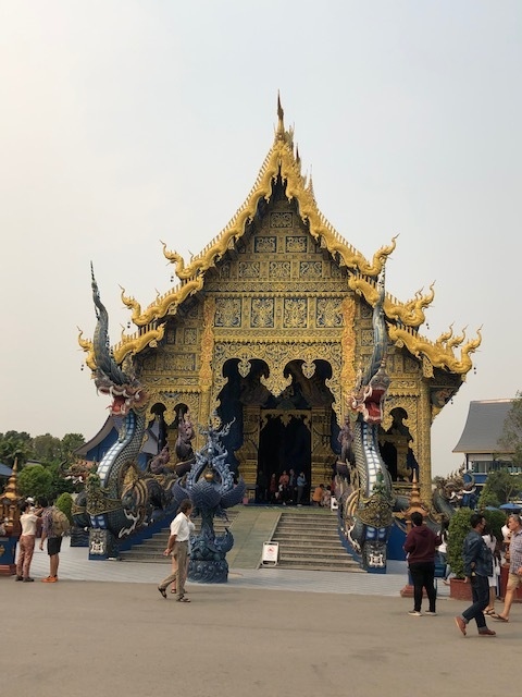 チェンライの青のお寺です。建物がすべてブルーで統一されインスタ映えします。ここには元々小さなお寺があったようですが、災害で壊れたために再建にあたってこのようなお寺になりました。ワット ローン クンの白と対比する青のお寺です。