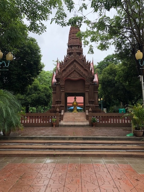 オレンジ色のチェーディーは高さが120m、タイ国内はもとより、世界で最も高い仏塔です。北側正面入り口にある礼拝堂内の立仏像台座にはラーマ6世の遺骨が納められている。タイには35,000以上のお寺があるとされていますが、その中の最高峰、王室1級寺院の一つです。
