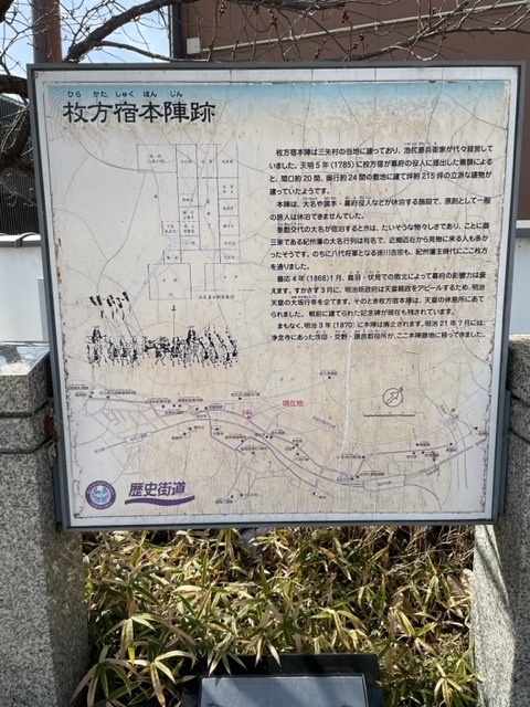 江戸時代に参勤交代のために京街道を通った諸大名泊まった本陣の跡です。参勤交代の際に紀州徳川家が定期的に宿泊したほか、淀川において京都と大阪を結ぶ三十石船の中継港としても賑わいました。今はミニ公園になっています。