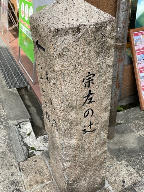 京街道と磐船街道の追分を示す道標。「送りましょか、送られましょか、せめて宗佐の辻までも」昔、宿場町の遊廓から客が帰る時、遊女がこの辻まで見送ったと伝えられる。辻脇に油屋宗佐の屋敷があったのが名前の由来です