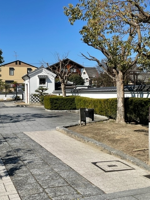歩きやすい石畳で所々にベンチがあり、トイレも周りの景色に調和するような白壁の造りになっています。市民の方々の散歩コースになっています