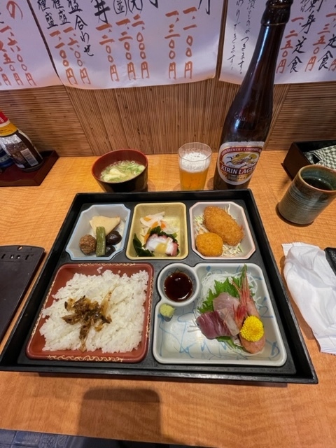 歩き疲れたので、今日は早い目に昼食にします。場所は近鉄郡山駅近くの「季之庄」です。たくさんランチメニューがありましたが、日替わりの弁当とビールを頂きました。弁当は酢の物、刺し身、炊き合わせ、揚げ物で少しボリュームが少ないですが美味しかったです。