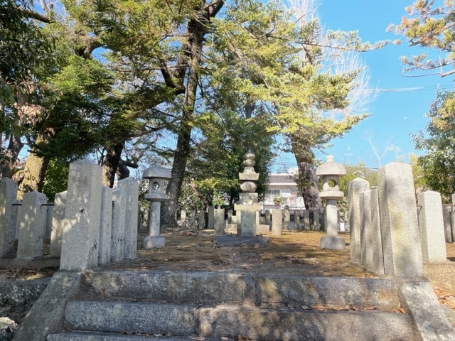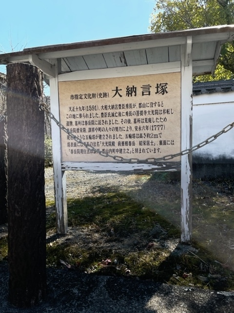 郡山城内で没した豊臣秀長がここに葬られました。この近くに豊臣秀吉が建てた大光院<だいこういん>という菩提寺があり、墓地を管理し菩提を弔っていました。しかし、豊臣家が滅んだあと、大光院は京都に移され、秀長の位牌は東光寺(のちの春岳院)に託されました。