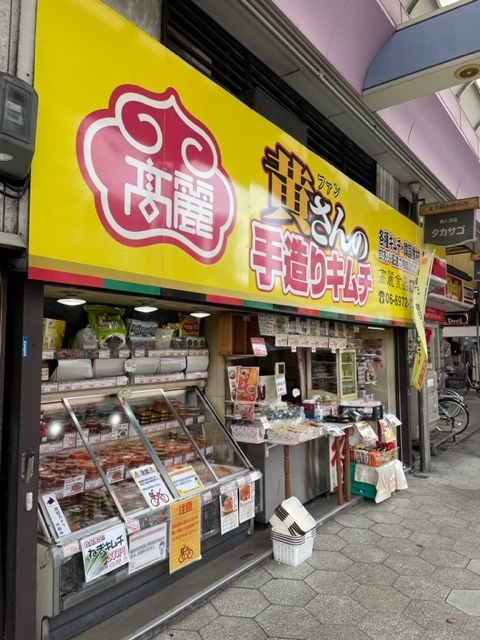 大阪で一番売れているキムチ屋で知られる「高麗食品」です。店頭には黄さんの手造りキムチを筆頭にナムル、チャンジャ、ケジャンなど新鮮な韓国食材が並びます。キムチの種類も豊富で白菜、大根、キュウリや珍しいものではれんこん、山芋、トマトもあります。