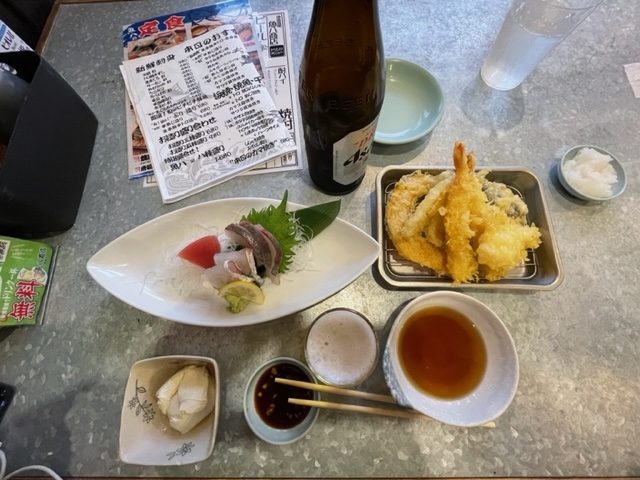 今回のランチは鶴橋駅前にある海鮮居酒屋「魚八商店」で頂きました。ランチメニューもたくさんありますが、さしみの3種盛りと天ぷらの盛り合わせとビールです。刺し身は新鮮でコリコリして美味しかったです。1時過ぎに入店しましたが、昼食のお客さんで賑わっていました。