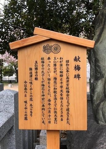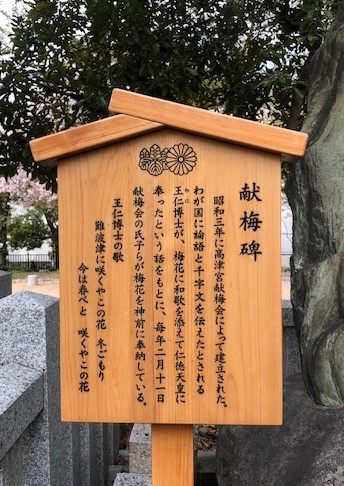 仁徳(にんとく)天皇の即位を喜び、王仁(わに)博士が梅花に和歌をそえて奉ったと伝えられている。王仁博士は、応神(おうじん)天皇に招かれて百済から日本に来た渡来人で、論語10巻と千字文1巻を携え、日本に漢字をもたらしたとされる。