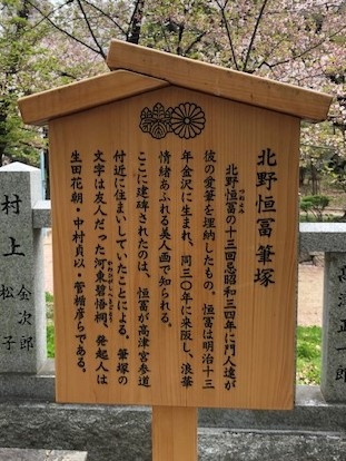 北野恒富は金沢出身の明治から昭和にかけて大阪で活躍した日本画家でとてもきれいな美人画で有名です。弟子たちが恒富の愛用していた筆を納めた筆塚を彼の十三回忌に建立しています。筆塚の文字は友人だった河東碧悟桐によるものだそうです。
