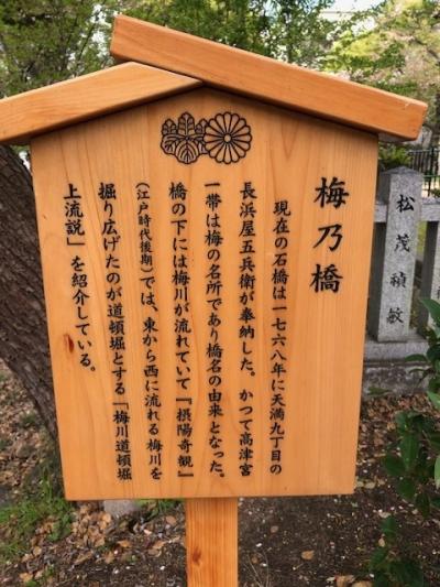 高津宮の表参道に架かる小さな石の反り橋。“梅乃橋”と言い、この下をその昔は“梅川”が流れ、川下は道頓堀川につながっていました。明和5年(1768)に天満九丁目の長浜屋五兵衛により奉納されました。高津宮が位置する上町台地は、古来より名水が湧くところとして知られていて、その湧き水の一つがこの川の水源だったようです。