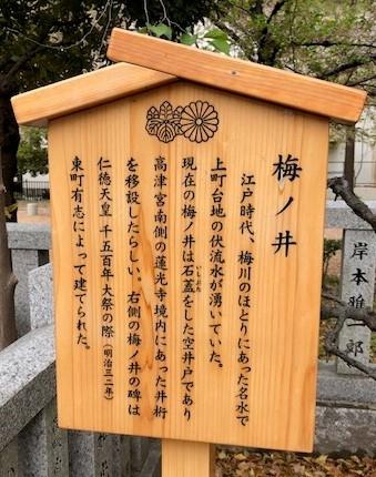 高津宮が位置する上町台地は、古来より名水が湧くところとして知られていて、その湧き水を集めた井戸です。梅乃橋の近くにあり、その下を流れていた梅の川の水源になっていたようです。現在は石蓋がされて空井戸のようです。
