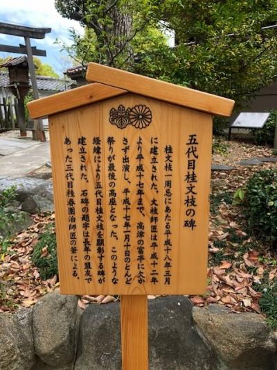 上方落語四天王の一人として戦後ほろびゆく危機にあった落語の復興に尽力し、多くの弟子を育てた五代桂文枝の碑です。碑は晩年に力を入れた創作落語「熊野詣」にちなみ、和歌山県新宮市産の花崗岩で出来ています。碑文は長年の盟友であった三代目桂春団治師の筆です。