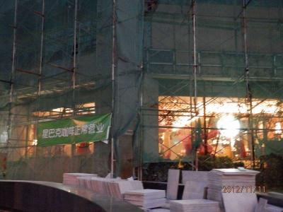 バス通りに面した1階のスターバックスは10月に見たときは休業だと思っていたら。11月には工事しながらも運営していた。店内の明かりが見えて、営業中の文字が架かっていた。