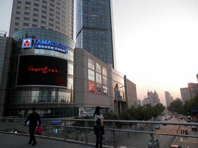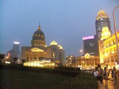 地下鉄1号線小白楼駅まえ。天津濱江万麗酒店は2002年に開業。三角にとがった形状は遠くからも目立つ建物。となりの凱旋門大廈や金皇大廈と特徴あるホテルが並ぶ。広い道路は地下鉄の地下道を利用して渡る。ホテルよこの欧風風情街は若者のファッションなんかが目に入る。
