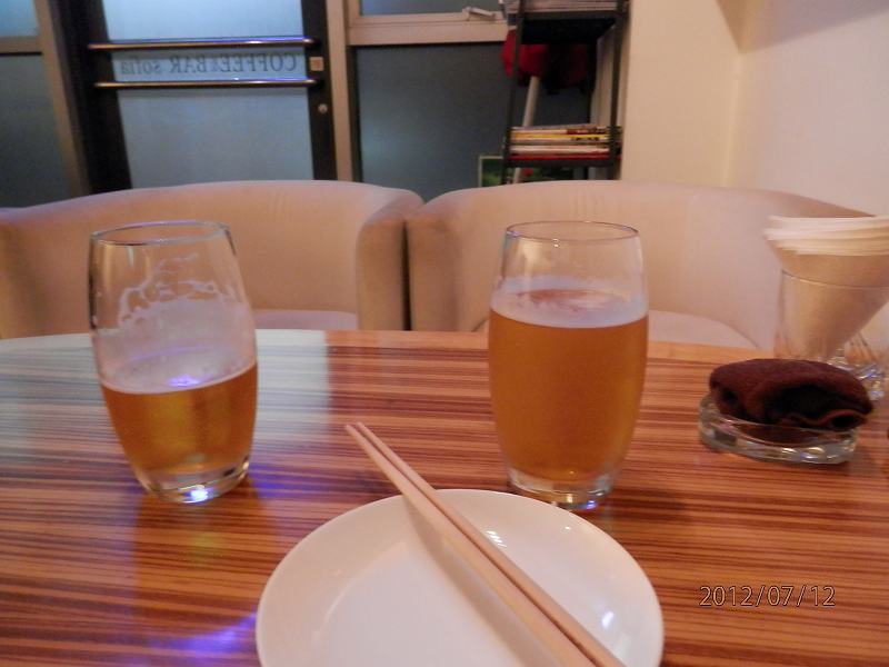 店内はサラリーマンがカウンターに並んでビールを飲んでいる。私たちはテーブルについたが低い目。雑誌やマンガも置いてある。- 旅行時期
