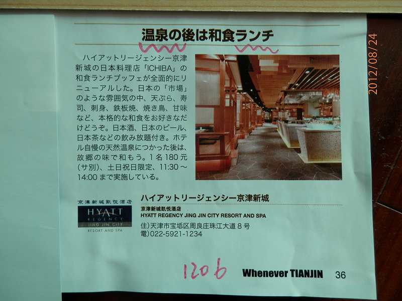 ホテル・ハイアット・リージェンシー京津新城の中にある日本料理店ICHIBA。市場のような雰囲気にリニューアルしたばかり。和食ランチビュッフェに飲み放題があるのは土、日、祝日に限定される。11:30~14:00まで。フリー誌Whenever1206号p.36より。