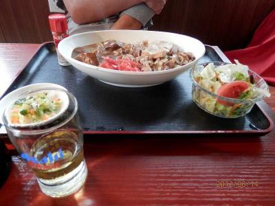 ランチ定食にはサラダ、キムチがつく。ご飯と味噌汁は御代わり自由。ビールを注文したから御代わりはしない。カレーと牛丼の合いがけを食べる。カレーは美味しい日本の味。SBカレーかと思う。牛丼用にSB唐辛子の小瓶がくる。