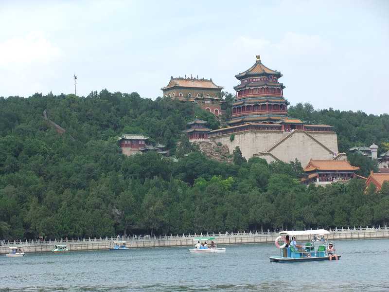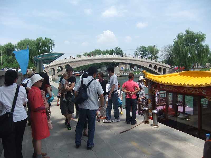 頤和園昆明湖内を周る舟は船着場も色々な場所にあるようだ。10分ほど乗る距離。ガイドが切符を購入して次の舟が来るまで待つ。地元観光客に順番なんて無く、ガイド自身が列のうしろに着く事を知らない。ツアー客を引き連れて進んでくる。ストレスだ。- 旅行時期