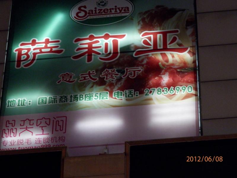 サイゼリアにはたくさんのチェーン店があった。すぐ近くの国際商城など。探してみたら屋上に大きな看板があった。天津以外は北京にも多数。