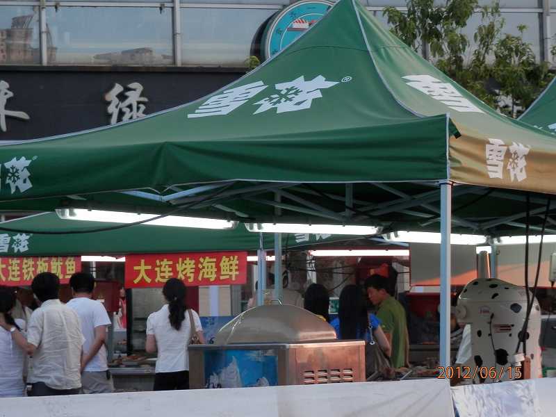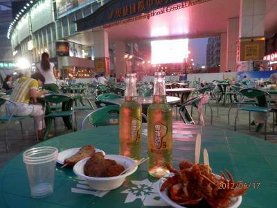 大型スクリーンではサッカーを見せてくれる。ビールは雪花の黄色い瓶のみ。生ビールは無い。緑色のミニスカートのビアガールが居る。居酒屋と同じで瓶の栓を抜いてくれるだけ。お酌はしてくれない。コーナーの屋台から購入するばかりじゃなく、食べ物の持込は許されるようだ。ビールしか頼まない西欧人もいる。