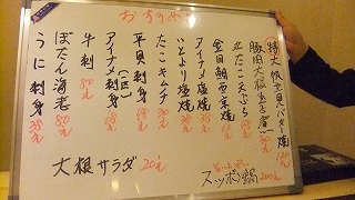フリー誌で見て行ってみた。他のサラリーマン二人客が「カルパッチョがあるなら、ワインは置かないのですか」と言っていた。いずれ揃えるらしい。私たちはアサヒ生ビール。